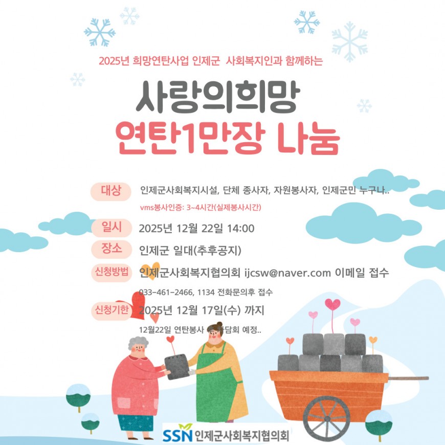 2025년 희망 연탄 사업에 적극 참여해주시고 후원해 주신 모든 분들에게 머리 숙여 존경과 감사의 말씀 드립니다.  인제군 사회복지협의회에서는 2025년 희망 연탄 사업으로 사랑의 왕! 다방 일일 찻집을 진행하였으며 많은 사회 복지 시설, 단체의 참여와 기업체, 자원봉사자 그리고 지역 주민 분들의 후원들로 모금한 사업비로 총 52가구, 연탄 5,175장, 난방유 3,875 L, 난방 지원금 80만원 총 10,495,000원의 많은 지원을 할수 있었습니다.